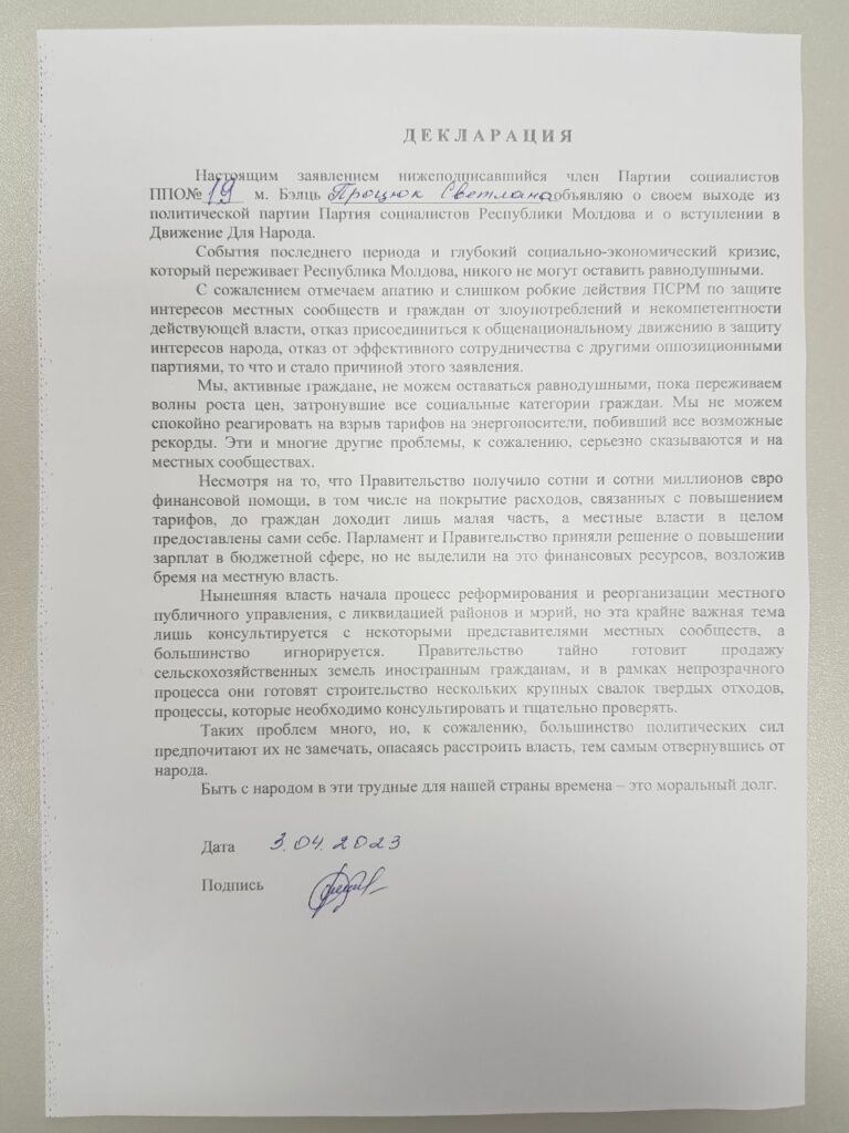 В доказательство Нестеровский опубликовал более 30 заявлений, в которых председатели и члены ППО социалистов в Бельцах заявляют о выходе из партии и вступлении в “Движение за народ”, которое возглавляет депутат от партии “Шор” Марина Таубер.